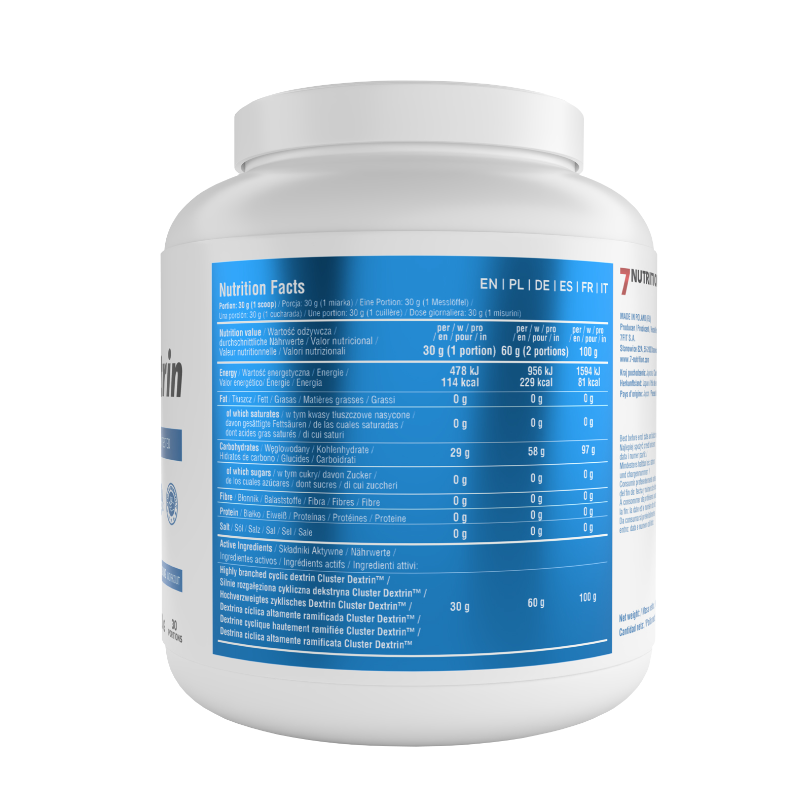 7Nutrition Cyclic Dextrin to wysokiej jakości suplement diety, który zawiera wyłącznie wysoko rozgałęzioną cykliczną dekstrynę (Cluster Dextrin™), pozyskiwaną z amylopektyny kukurydzianej w zaawansowanym procesie enzymatycznym. Jest to jedno z najbardziej innowacyjnych i funkcjonalnych źródeł węglowodanów dla sportowców, których treningi trwają długo, są intensywne lub wymagają precyzyjnego zarządzania energią i nawodnieniem. Cykliczna dekstryna to forma węglowodanów o niskiej osmolarności i bardzo wysokiej tolerancji żołądkowo-jelitowej, co czyni ją idealną dla osób z wrażliwym przewodem pokarmowym.