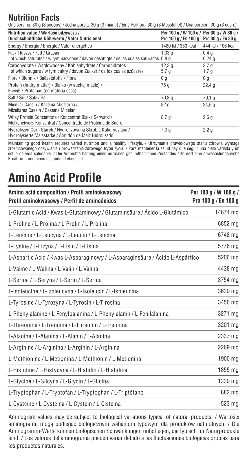 Składniki:82% kazeina micelarna (z mleka); 8,7% koncentrat białka serwatki (z mleka); 7,3% hydrolizowana skrobia kukurydziana; aromat, substancja stabilizująca: guma ksantanowa; substancja słodząca: sukraloza. Produkt może zawierać orzechy oraz jaja.