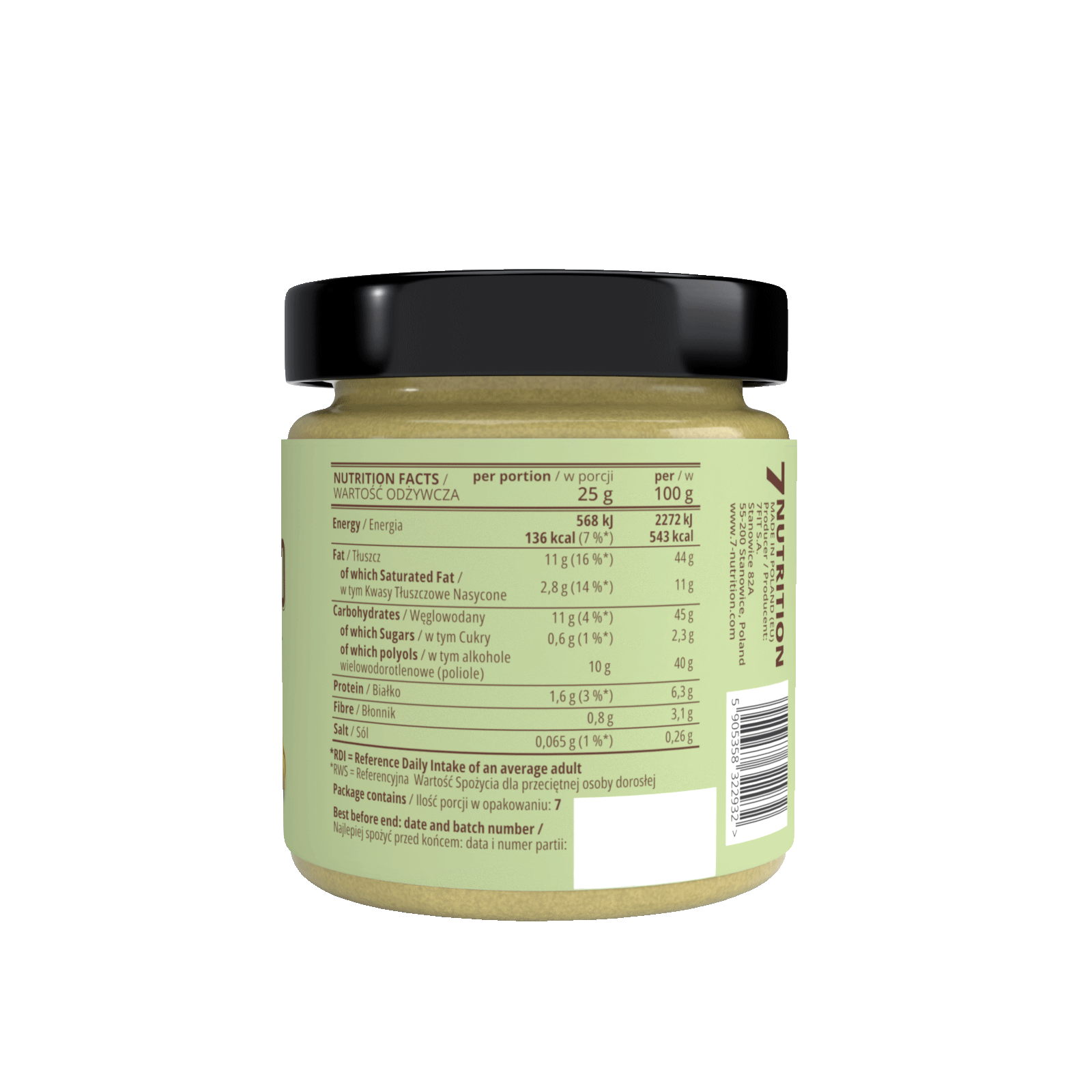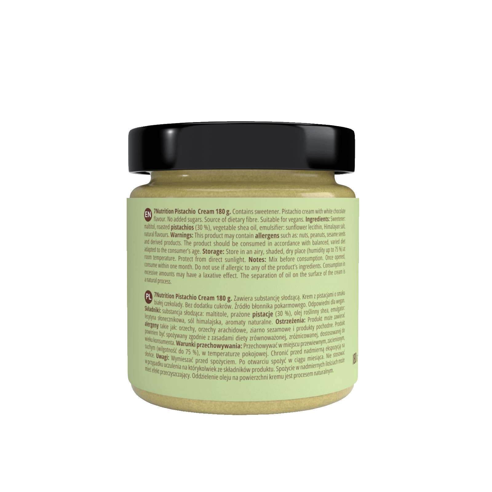 7Nutrition Pistachio Cream 180 g. Zawiera substancję słodzącą. Krem pistacjowy o smaku białej czekolady. Bez dodatku cukrów. Źródło błonnika pokarmowego. Odpowiedni dla wegan.