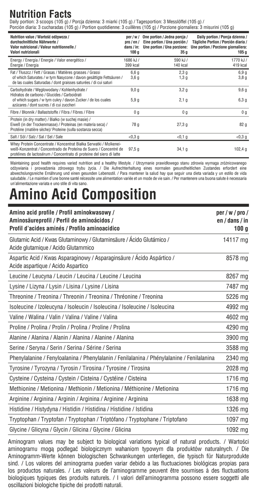 Składniki:100 % koncentrat białka serwatki (z mleka), emulgator: lecytyna słonecznikowa. Produkt może zawierać soję, orzechy i białka jaj.