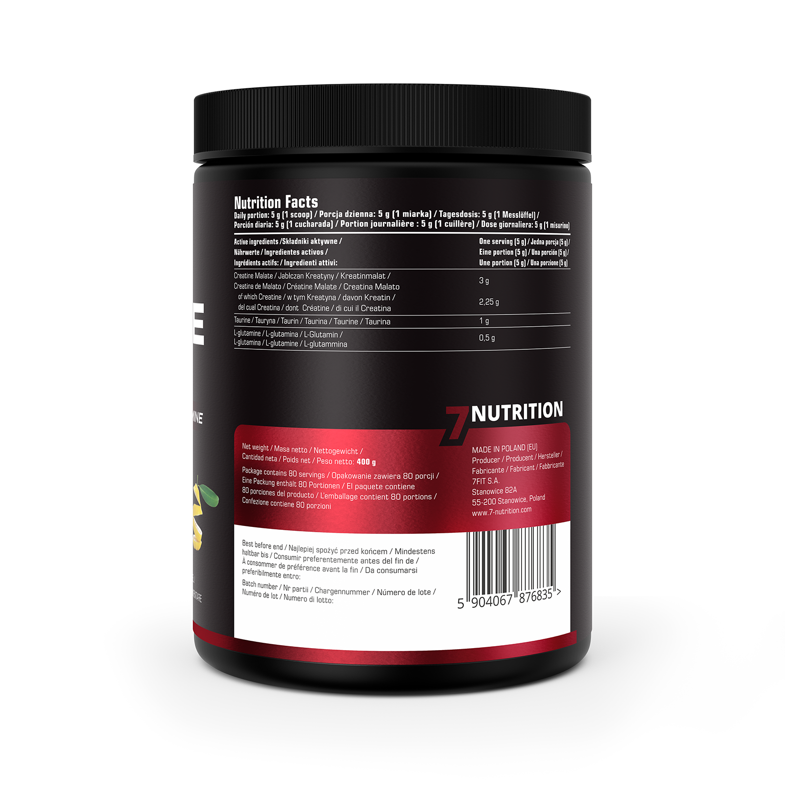 7Nutrition CREATINE STRONG 400 g. Suplement diety. Zmikronizowany jabłczan kreatyny z dodatkiem tauryny. Przeznaczony dla sportowców dyscyplin siłowo-wytrzymałościowych. Powoduje mniejszą retencję wody niż popularny monohydrat. Regularne stosowanie kreatyny zapewnia wzrost wytrzymałości, siły oraz masy mięśniowej.