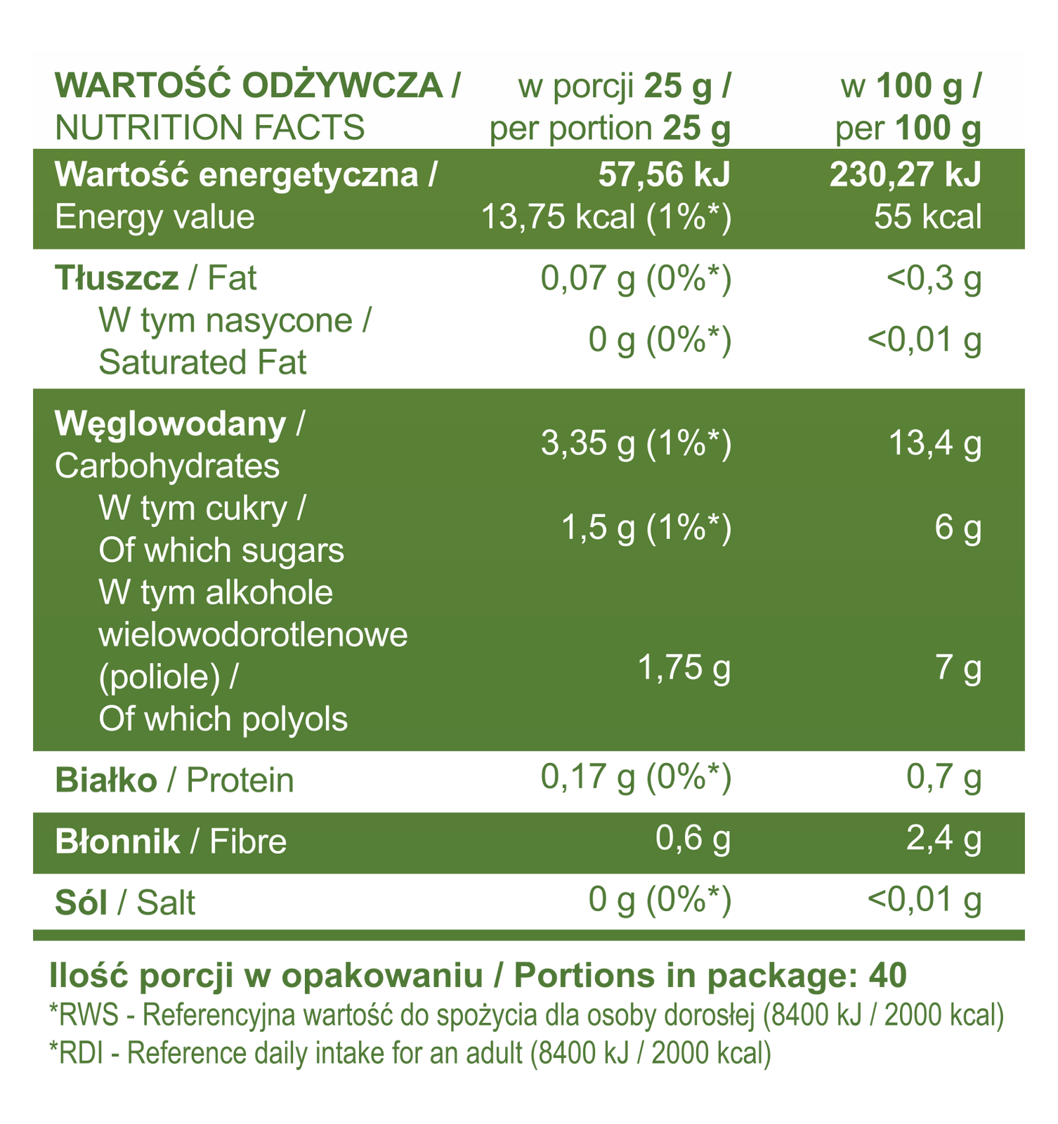 | WARTOŚĆ ODŻYWCZA | Na 25 g | Na 100 g |