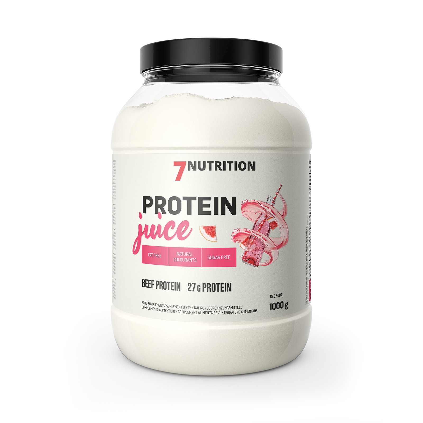Odżywka białkowa na bazie hydrolizatu białka wołowego. Każda porcja dostarcza aż 27 g białka w suchej masie. Dzięki lekkiej, orzeźwiającej formule, doskonale sprawdza się jako napój potreningowy, wspierając regenerację mięśni, budowę masy i codzienne zapotrzebowanie na białko. Protein Juice nie zawiera cukru i ma klarowną formułę, co oznacza, że bardziej przypomina orzeźwiający napój niż klasyczny, mleczny koktajl białkowy. Jest dostępny w 7 pysznych smakach, takich jak: tropikalny, czerwona oranżada, truskawka-malina, wiśnia-jabłko, mango-ananas, pina colada, arbuz-truskawka.