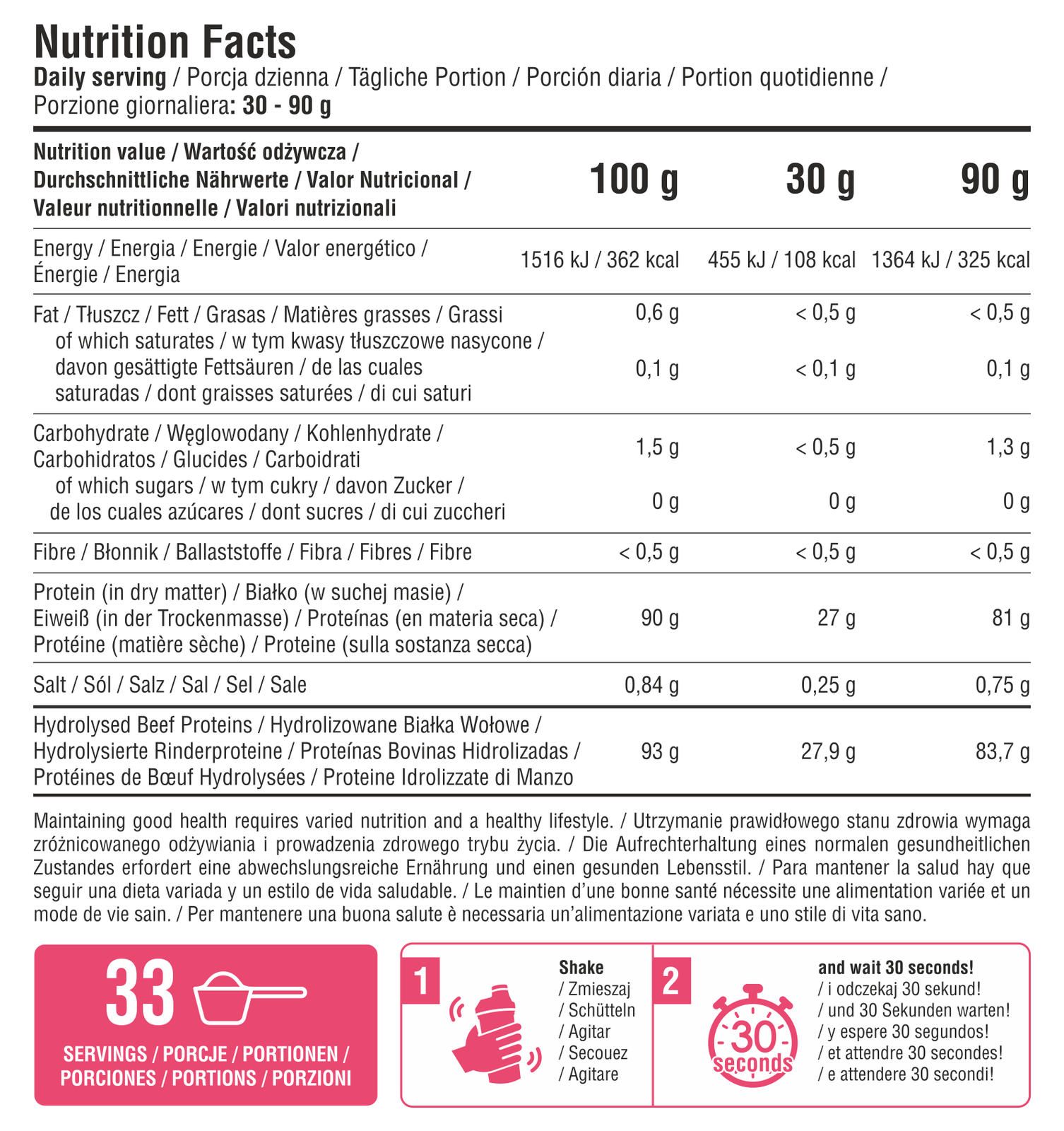 Składniki93 % hydrolizowane białka wołowe; regulator kwasowości: kwas cytrynowy; aromat; substancja przeciwpieniąca [dwutlenek krzemu, monostearynian sorbitolu, lecytyny*, mieszanina tokoferoli];koncentrat czarnej marchwi w proszku; barwnik: beta-karoten; substancja słodząca: sukraloza. *ze słonecznika