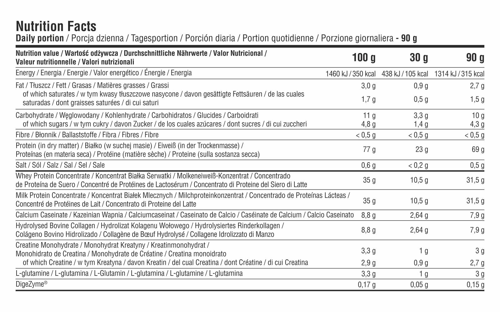 Składniki35 % koncentrat białka serwatkowego (z mleka); 35 % koncentrat białek mlecznych (z mleka); 8,8 % kazeinian wapnia (z mleka); 8,8 % hydrolizat kolagenu wołowego; monohydrat kreatyny; L-glutamina; wzmacniacz smaku: glicyna; aromat; stabilizator: guma arabska (E414); DigeZyme® - kompleks multienzymatyczny; substancja słodząca: sukraloza.Produkt może zawierać: jaja, soję, orzechy, orzechy ziemne, zboża zawierające gluten, ryby, skorupiaki.DigeZyme® jest zastrzeżonym znakiem towarowym firmy Sabinsa.