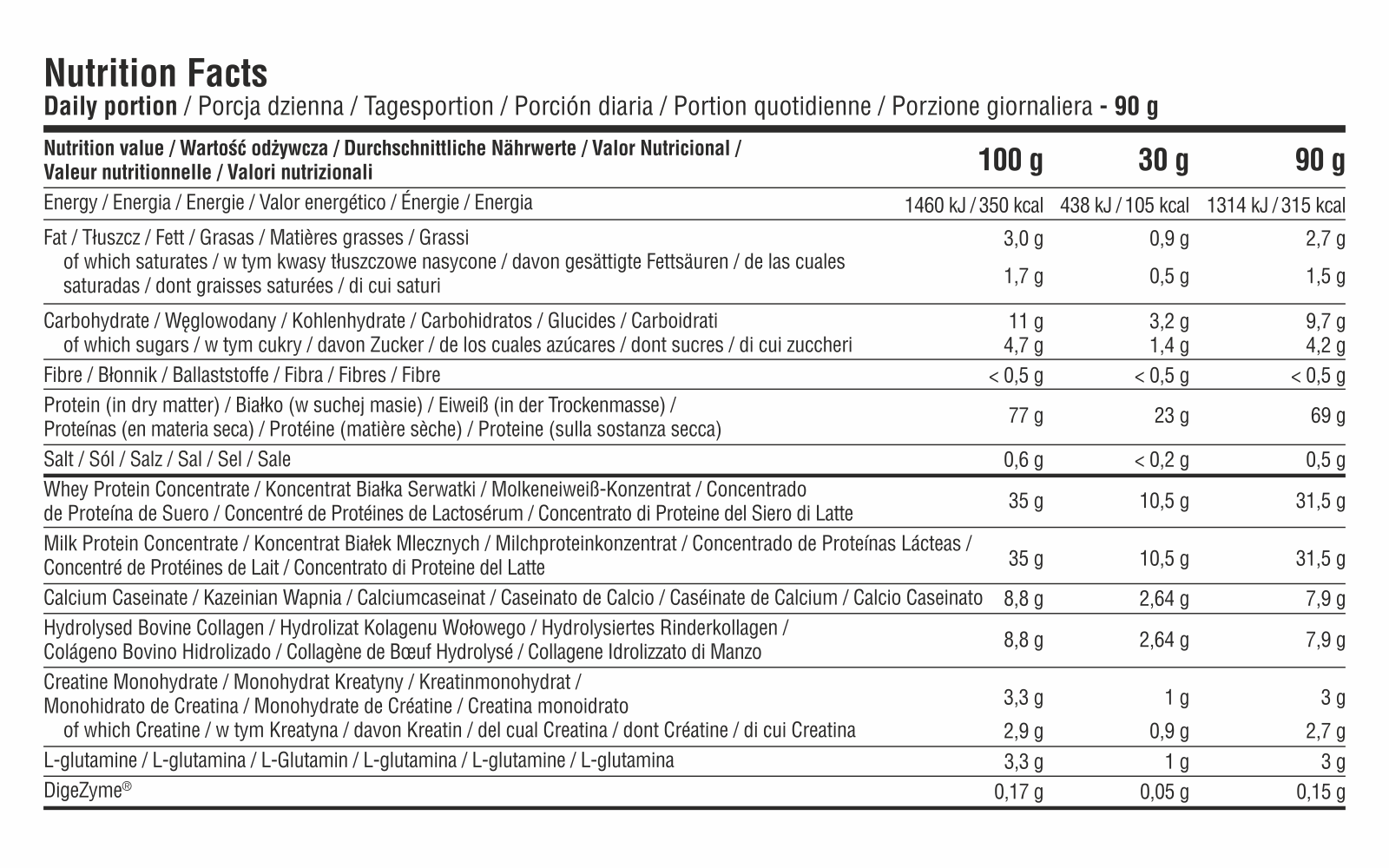 Składniki35 % koncentrat białka serwatkowego (z mleka); 35 % koncentrat białek mlecznych (z mleka); 8,8 % kazeinian wapnia (z mleka); 8,8 % hydrolizat kolagenu wołowego; monohydrat kreatyny; L-glutamina; wzmacniacz smaku: glicyna; aromat; stabilizator: guma arabska (E414); DigeZyme® - kompleks multienzymatyczny; substancja słodząca: sukraloza.Produkt może zawierać: jaja, soję, orzechy, orzechy ziemne, zboża zawierające gluten, ryby, skorupiaki.DigeZyme® jest zastrzeżonym znakiem towarowym firmy Sabinsa.
