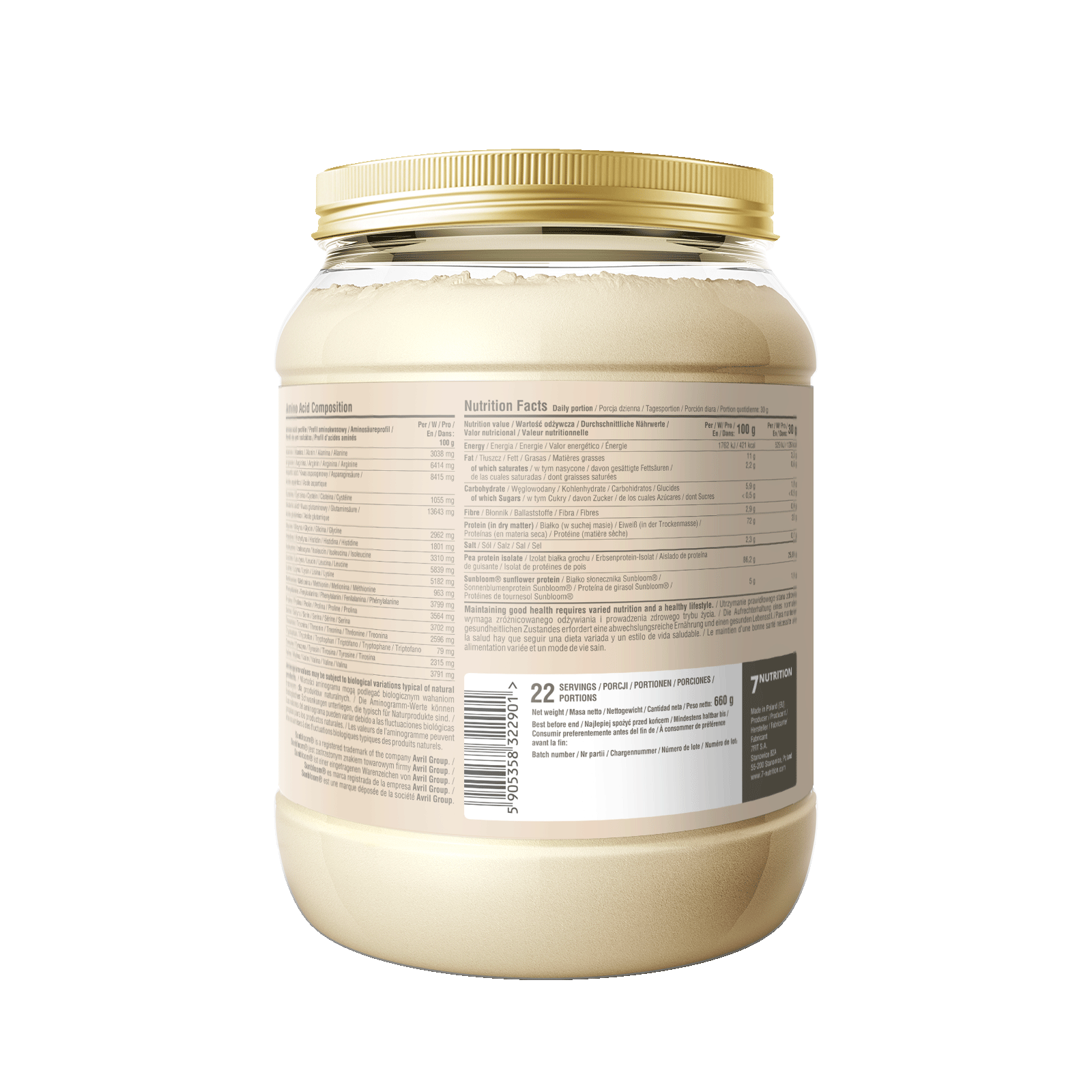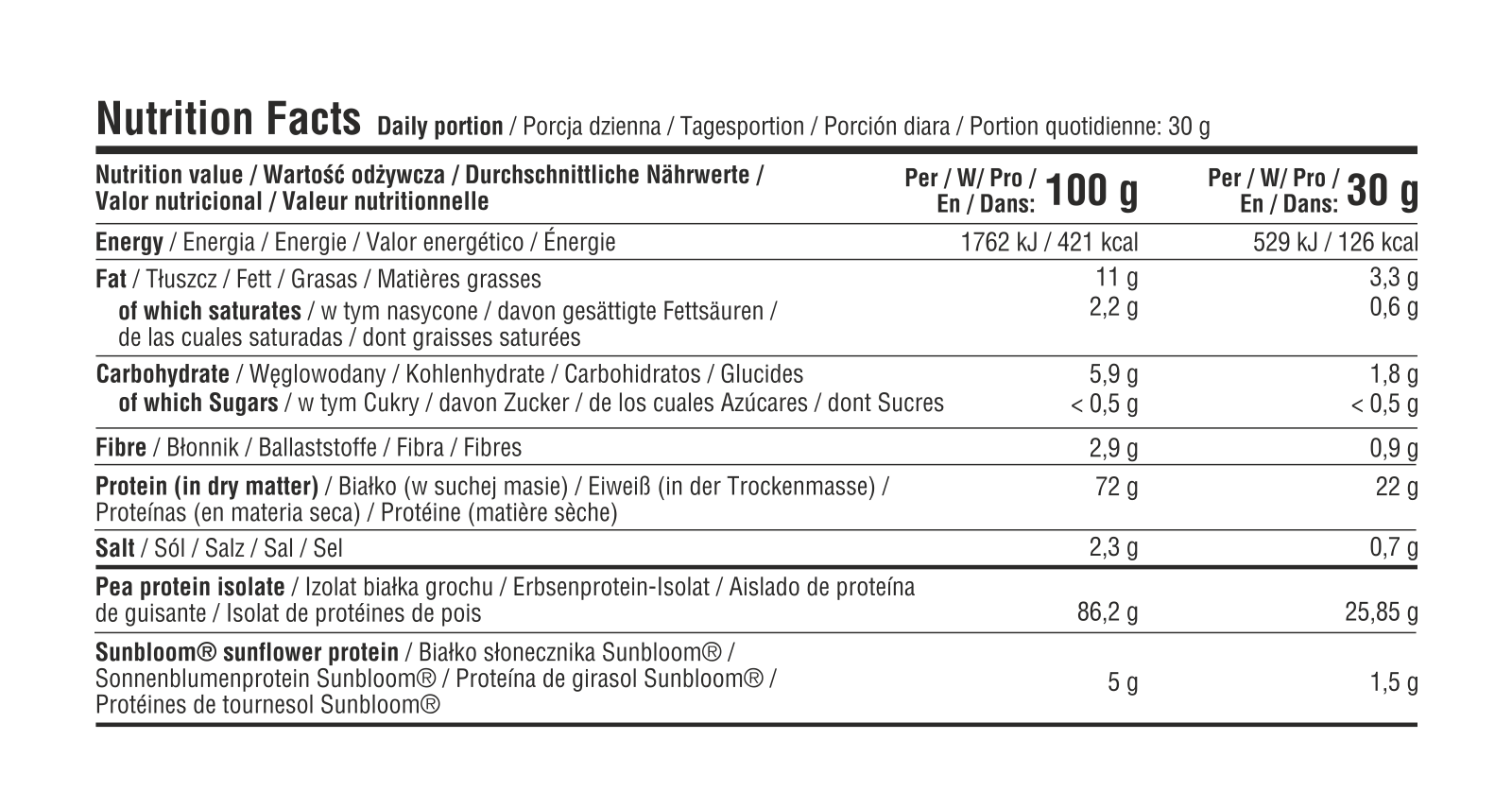 • Roślinna odżywka białkowa oparta na izolacie białka grochu i białku słonecznikowym.