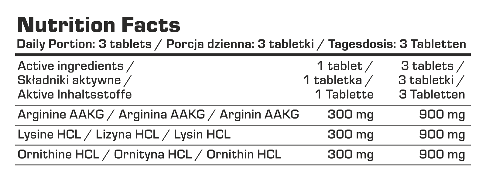 SKŁADNIKI: Alfa-ketoglutaran L-argininy (AAKG); L-lizyna; L-ornityna HCL, wodorofosforan wapnia, fosforan wapnia, środek przeciwzbrylający: sole magnezowe kwasów tłuszczowych.