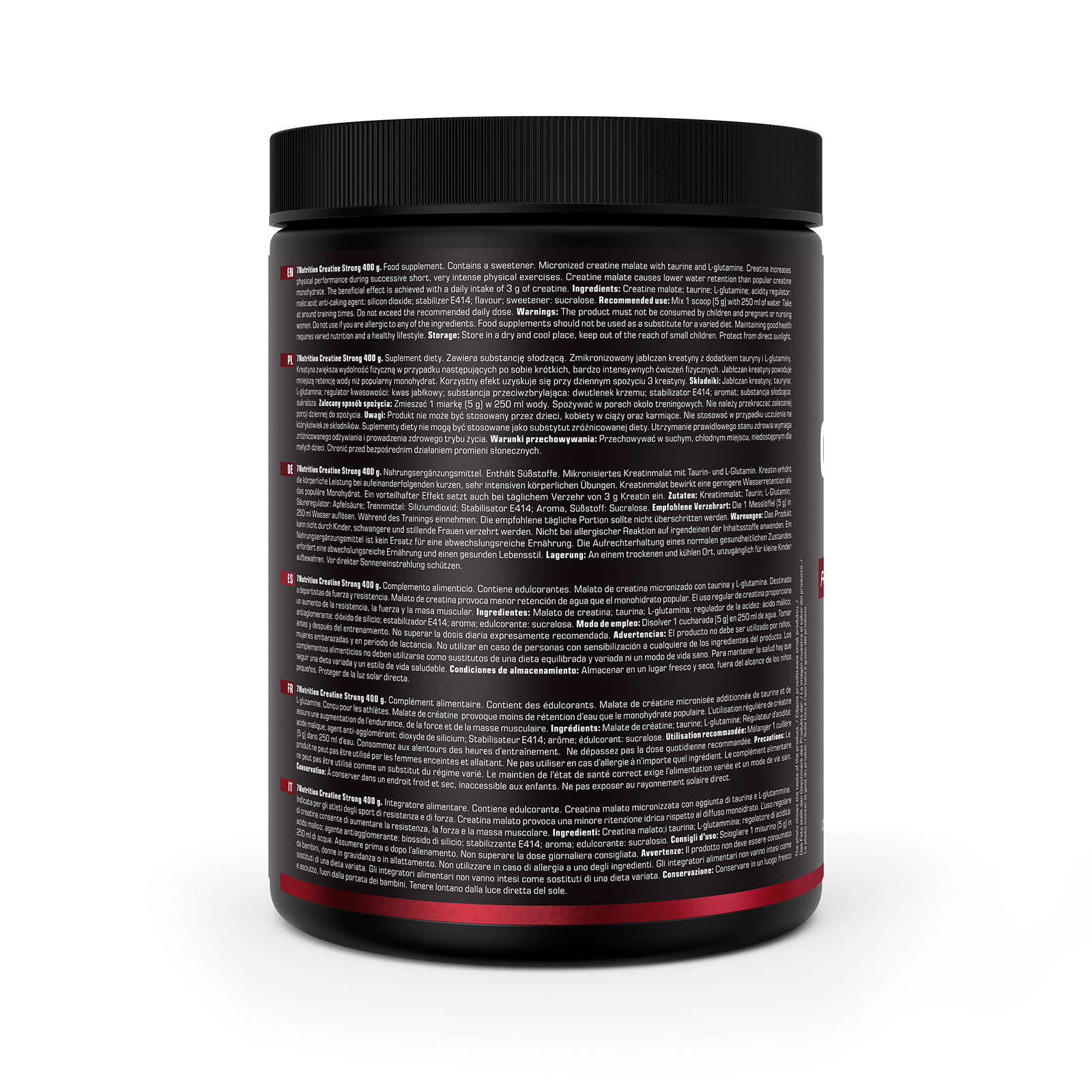 7Nutrition CREATINE STRONG 400 g. Suplement diety. Zmikronizowany jabłczan kreatyny z dodatkiem tauryny. Przeznaczony dla sportowców dyscyplin siłowo-wytrzymałościowych. Powoduje mniejszą retencję wody niż popularny monohydrat. Regularne stosowanie kreatyny zapewnia wzrost wytrzymałości, siły oraz masy mięśniowej.