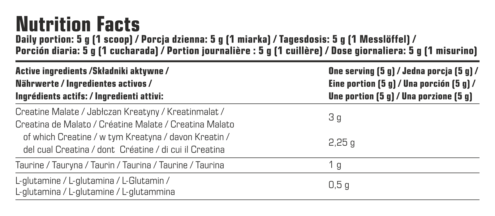 SKŁADNIKI: Jabłczan kreatyny; tauryna; L-glutamina; regulator kwasowości: kwas jabłkowy; substancja przeciwzbrylająca: dwutlenek krzemu; stabilizator E414; aromat; substancja słodząca: sukraloza.