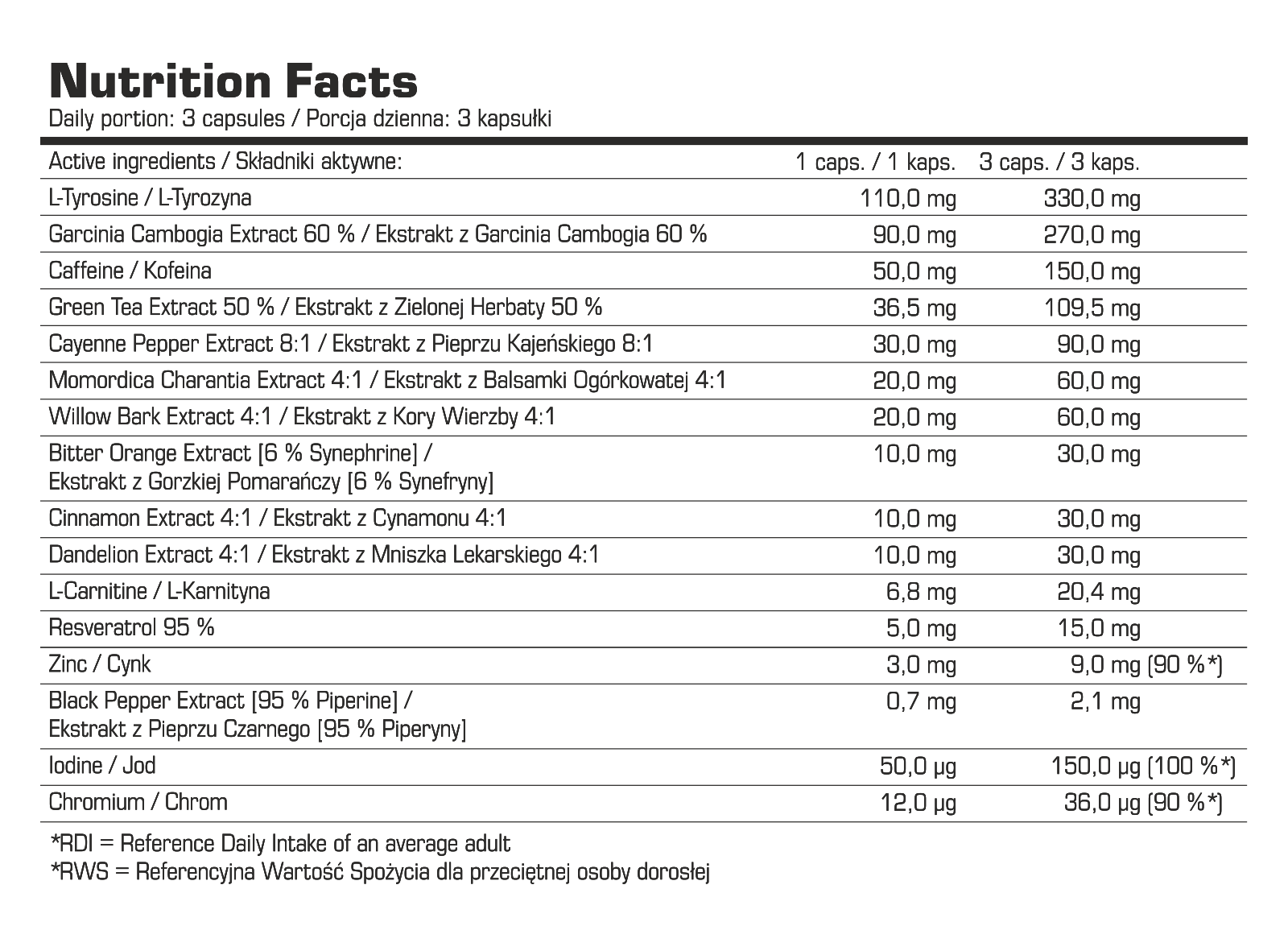 | Ekstrakt z gorzkiej pomarańczy (6% Synefryny) | 30,00 mg | 10,00 mg |