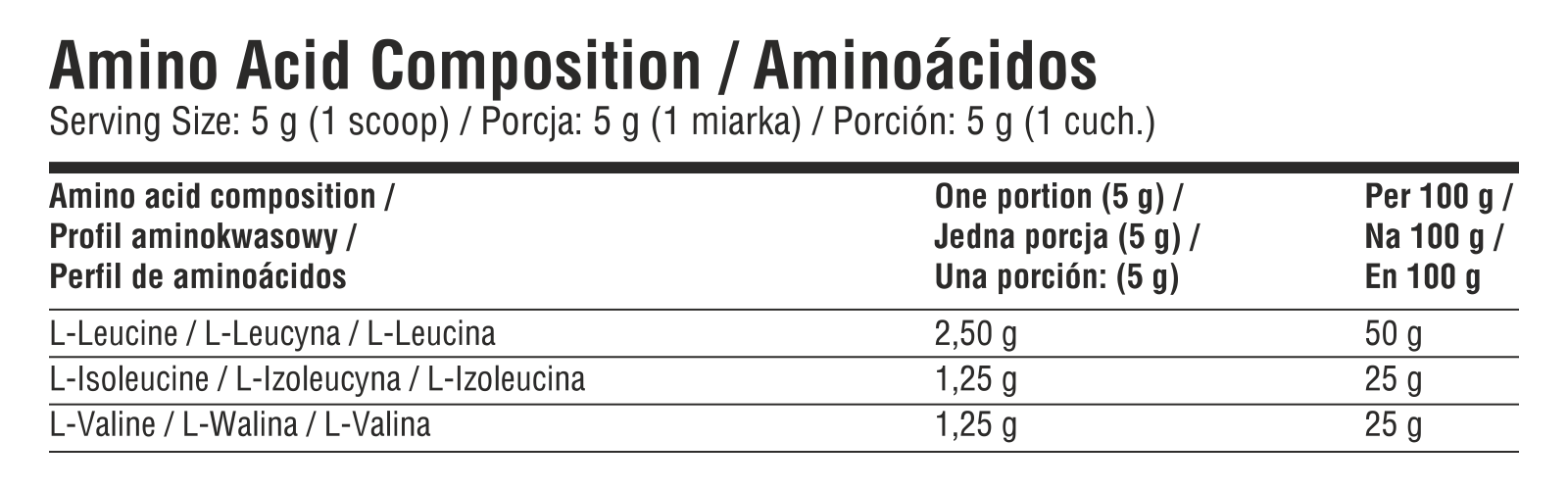 Połączenie najważniejszych aminokwasów egzogennych L-Leucyny, L-Waliny, L-Izoleucyny w optymalnych proporcjach 2:1:1. Aminokwasy te muszą być dostarczane z pożywienia, a suplementacja BCAA zaleca się każdemu, kto prowadzi sportowy tryb życia. Bez dodatków substancji słodzących, wypełniaczy oraz cukrów. 100% BCAA.